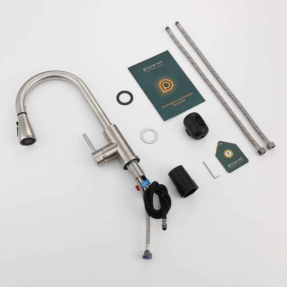 Смеситель для кухни с выдвижным изливом Splenka S203.49.05. Цвет: сатин. Смеситель для кухни с выдвижным изливом из нержавеющей стали. Излив смесителя оснащен аэратором, что обеспечивает экономичный расход воды. Излив поворотный и выдвижной. Механизм смесителя: керамический картридж. Управление рычажное. Подводка гибкая 1/2. Режимы лейки: 2. Данная модель отличается своей долговечностью и хорошим качеством.
