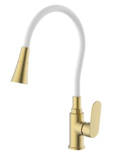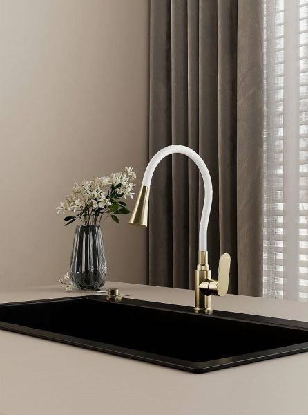 Смеситель для кухни Splenka S41.43.03 идеально подходит для кухонной мойки, раковины любого типа. Смеситель имеет 2 режима: поток воды и душ. Кран с гибким изливом имеет необычный внешний вид и особую конструкцию. С помощью гибкого шланга можно самостоятельно регулировать глубину выноса и высоту излива, что позволит избежать лишнего разбрызгивания воды. Также с помощью силиконового излива не составит труда добраться до всех мест в мойке, а также упрощает мытье посуды и продуктов. Стильный латунный смеситель имеет свойство шумоподавления.