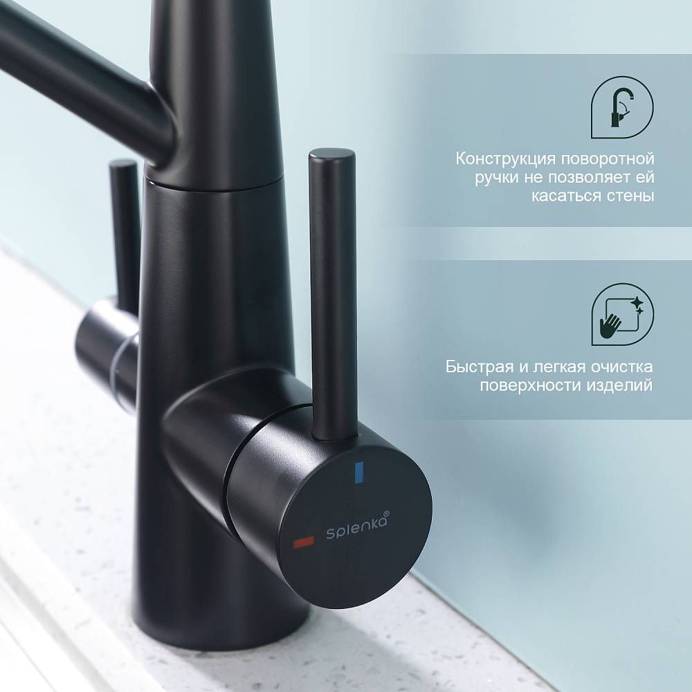 Смеситель для кухни с подключением к фильтру питьевой воды Splenka S71.62.06. Цвет: черный. Гибкая подводка 50 см идет в комплекте. Благодаря грамотно разработанной конструкции, прибор отлично справляется с регулированием температуры и напора потоков воды. Однорычажные смесители максимально удобны при эксплуатации, всего одним движением руки можно закрыть или открыть воду, имеют стильный внешний вид, а также комфортность в использовании. Гарантия 5 лет.