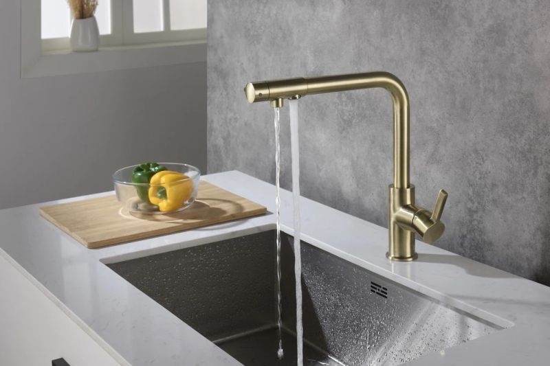 Смеситель Timo Hette 1026 с функцией подключения фильтра для питьевой воды предназначен для монтажа на кухонную мойку или столешницу. Высокий излив подходит для моек с двумя чашами, а также позволяет справляться с мытьем габаритной посуды. В нижней части смесителя установлена трубка с адаптером для соединения с трубкой фильтра. Подача фильтрованной воды осуществляется поворотом ручки дивертора, расположенной на изливе смесителя.