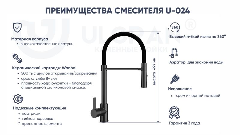 Смеситель ULGRAN U-024 – это стильный и современный кухонный смеситель с высоким гибким изливом черного цвета. Материал корпуса выполнен из высококачественной латуни, сверху корпус смесителя имеет специальное черное матовое покрытие.