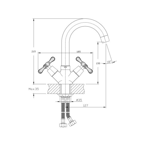 Смеситель для раковины и кухонной мойки RUSH арт. BI7650-23 с металлической ручкой из коллекции Bianki изготовлен из высококачественной латуни и имеет вентильное управление. В смеситель установлены кран-буксы (RSH502) с керамическими пластинами. Высота смесителя 215 мм. Излив поворотный 127 мм. Высота излива до аэратора 150 мм. Аэратор изготовлен из пластика с нержавеющим корпусом, угол наклона - 15 гр. В комплекте гибкая подводка с латунными гайками 35см - 2 шт, присоединительная гайка S-30мм, втулка-27мм, фум-лента, индивидуальный пакет, паспорт, гарантийный талон.