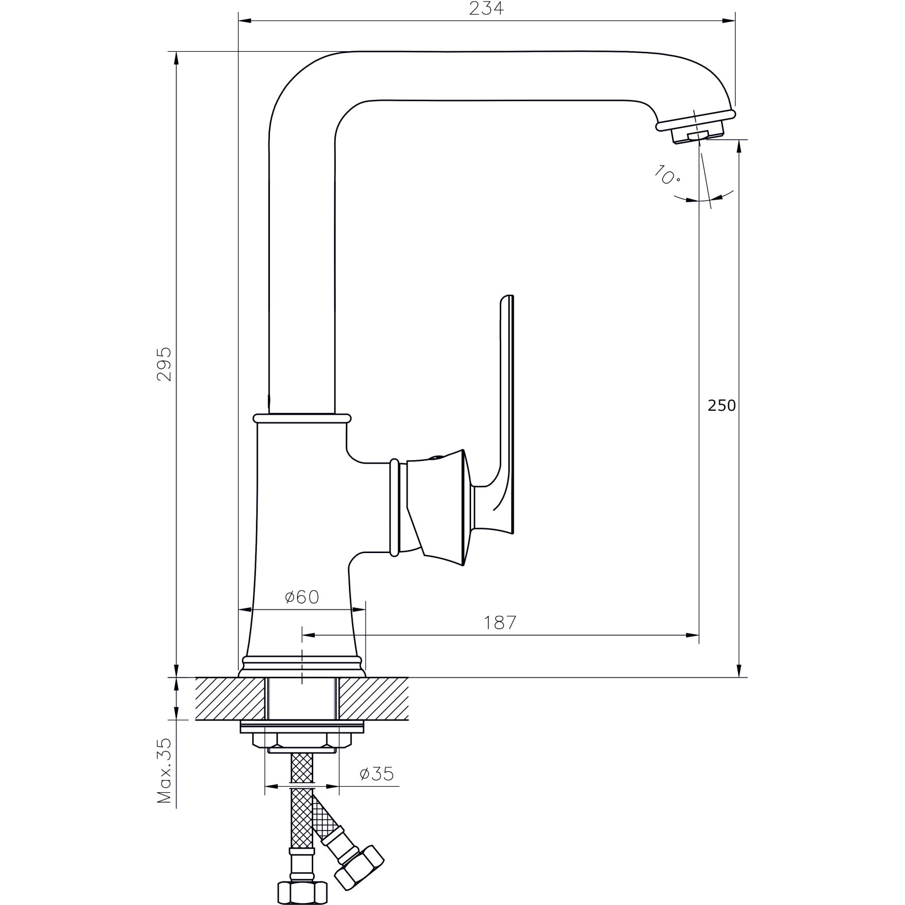 Смеситель для кухни с поворотным изливом RUSH арт. FLG0835-2 с металлической ручкой из коллекции Flores изготовлен из высококачественной латуни и имеет рычажное управление. В смеситель установлен картридж D-35 с керамическими пластинами. Высота смесителя 295 мм. Излив поворотный, 187 мм. Высота излива до аэратора 253 мм. Аэратор изготовлен из пластика с нержавеющим корпусом, угол наклона аэратора- 10 гр. В комплекте гибкая подводка с латунными гайками 45 см - 2шт, универсальная присоединительная группа для установки на горизонтальную поверхность, фум-лента, индивидуальный пакет, паспорт, гарантийный талон.