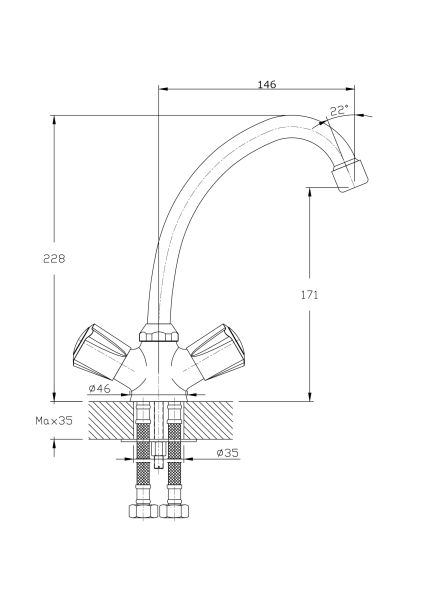 Смеситель для кухни с высоким, поворотным изливом RUSH арт. PI7950-22 с металлической ручкой из коллекции Pioneer изготовлен из высококачественной латуни и имеет вентильное управление. В смеситель установлены кран-буксы (RSH502) с керамическими пластинами. Высота смесителя 228 мм. Излив поворотный (360гр), 146 мм. Высота излива до аэратора 171 мм. Аэратор изготовлен из пластика с нержавеющим корпусом, угол наклона - 22 гр. В комплекте универсальная присоединительная группа (шпилька-2шт), гибкая подводка с латунными гайками 35см - 2шт, фум-лента, индивидуальный пакет, паспорт, гарантийный талон.