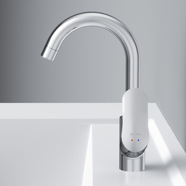 вид и идеально подойдет для раковины с глубокой чашей, а благодаря обширной зоне движения ручки управлять температурой воды еще проще.