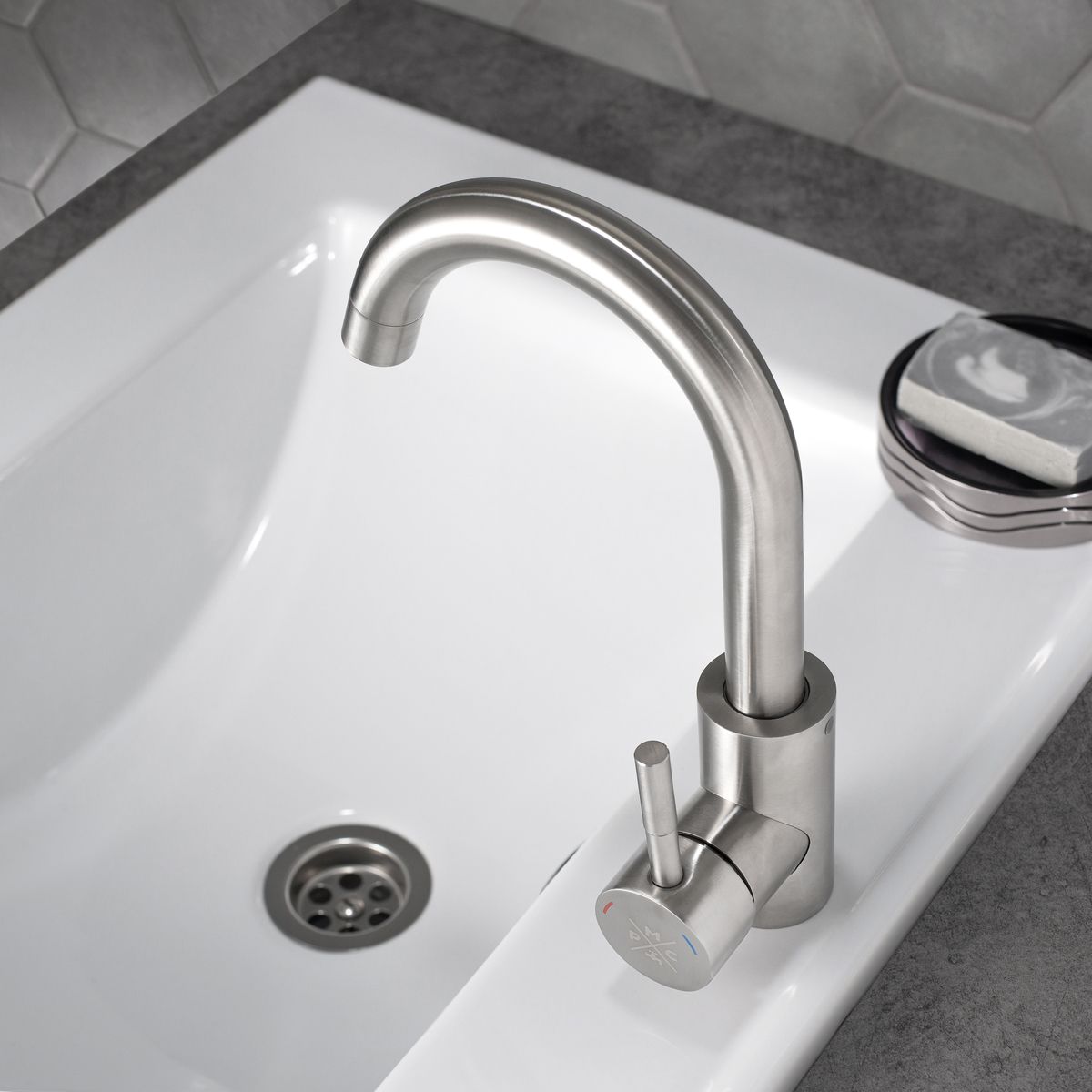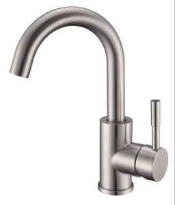 Одноручковый смеситель для умывальника из нержавеющей стали с высоким изливом станет привлекательным и функциональным атрибутом ванной комнаты.