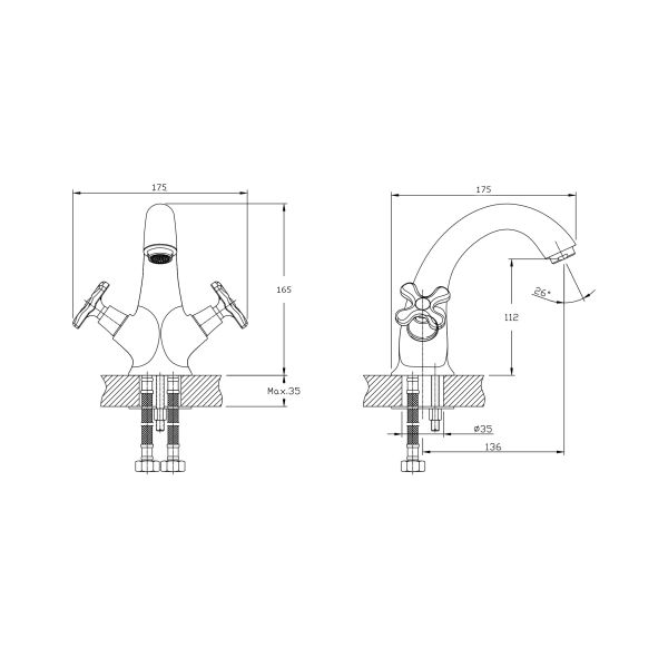 Смеситель для раковины RUSH арт. SA5350-11 с металлической ручкой из коллекции Sakhaline изготовлен из высококачественной латуни и имеет вентильное управление. В смеситель установлены кран-буксы (RSH502) с керамическими пластинами. Высота смесителя 165 мм. Излив литой неповоротный 136 мм. Высота излива до аэратора 112 мм. Аэратор изготовлен из пластика с нержавеющим корпусом, угол наклона - 26 гр. В комплекте универсальная присоединительная группа (шпилька-2шт), гибкая подводка с латунными гайками 35см - 2шт, фум-лента, индивидуальный пакет, паспорт, гарантийный талон.