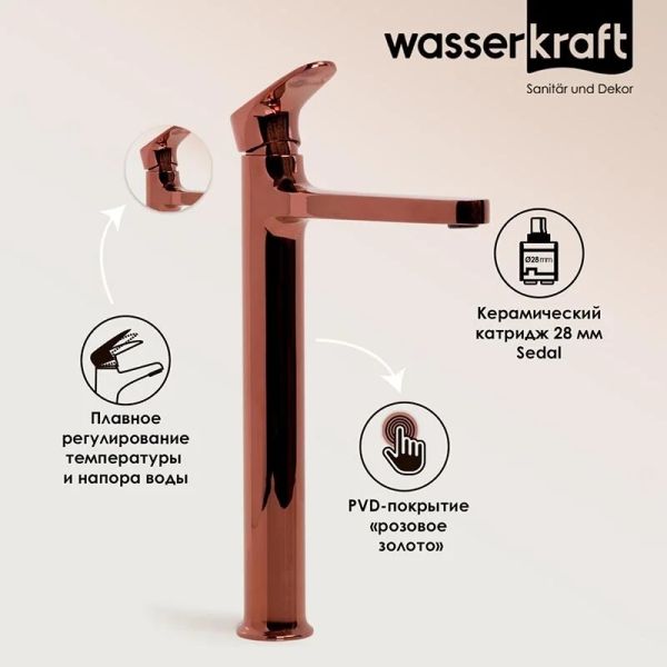 Смеситель для раковины WasserKRAFT Asphe, розовое золото, 7703H Назначение: для раковины Шири... Подробнее