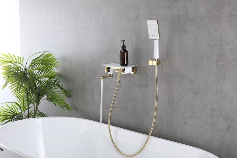Смеситель Lemark Mista для ванны и душа с душевым гарнитуром, белый с золотом, LM6414WGОсновные характеристики:Смеситель для ванны и душа с полкой