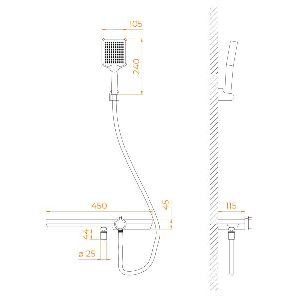 • Ручной душ на гибком шланге из ПВХ длиной 1.5 м, с тремя режимами струи, изготовленный из устойчивого к износу ABS-пластика;