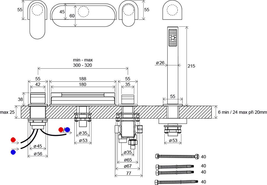 • исполнение: устанавливается на ванну с широким и горизонтальным бором; врезной на 4 отверстия; с лейкой