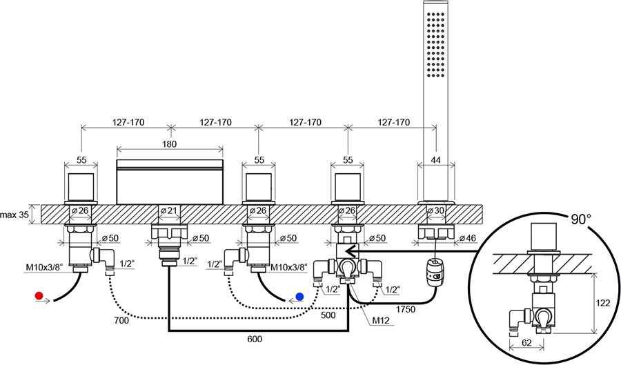 • исполнение: устанавливается на ванну с достаточно широким и горизонтальным бортом; врезной на 5 отверстий; с лейкой.