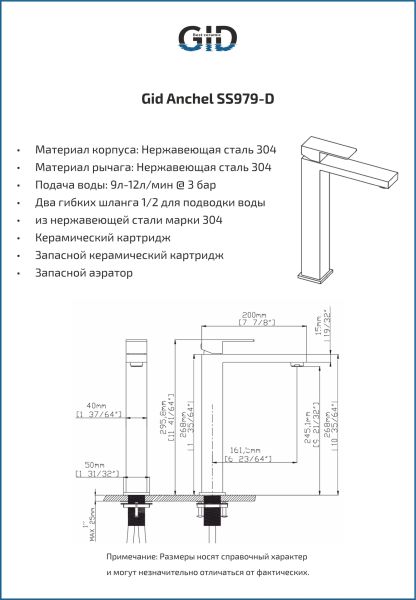 Смеситель высокий для раковины Gid Anchel SS979-CH-D SS979CHD хром