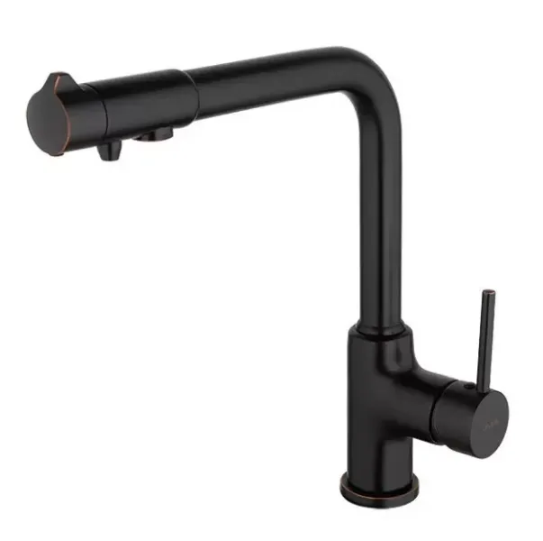 Cмеситель для кухонной мойки Gappo G4390-10 с подключением фильтра питьевой воды - стильная и практичная однорычажная модель с высоким поворотным изливом. Смеситель легок в установке, не требуется сверления дополнительных отверстий под фильтр: обычная и фильтрованная вода подаются через один излив, а компактный рычажок на смесителе включает подачу воды из-под фильтра. Однорычажное управление обеспечивает плавную настройку температуры и регулировку напора воды. Цвет - черный.