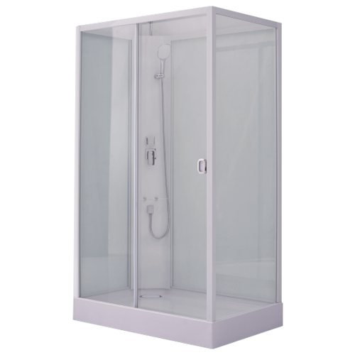 Прямоугольная, без пара. без крыши, с акриловым поддоном высотой 150 мм, верхним и ручным душем, стекла 8мм прозрачные, но по желанию могут быть тонированные, матовые, белые. Без гидромассажа спины. Простая и быстрая установка, сборка без силикона.
