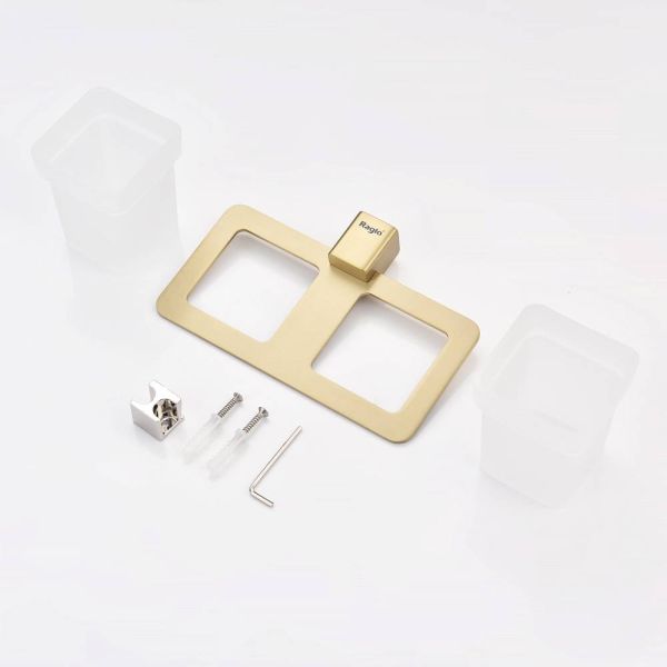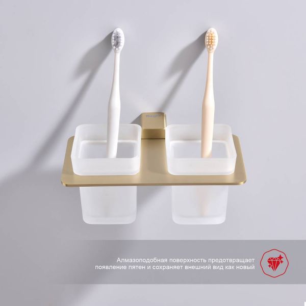 Дизайн: Держатель выполнен в цвете золотой сатин, что придает ему современный и элегантный вид. Лаконичный дизайн стаканов гармонично сочетается с любым интерьером ванной комнаты.
