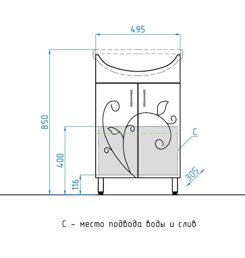 Тумба напольная бренда "Style Line" Эко Фьюжн 9. Фурнитура - хром, тонкая элегантная декоративная фрезеровка фасадов. Направляющие полного выдвижения Hettich; эксклюзивный декор "Луино" - ламинация внутренней стороны изделия; сборка изделия с помощью эксцентриковых стяжек Hafele; все материалы полностью влагостойкие. Данная тумба предусматривает открытую подводку воды