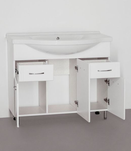 Тумба напольная бренда "Style Line" Эко Стандарт 26 с 2 ящиками. Фурнитура - хром, эксклюзивный декор "Луино" - ламинация внутренней стороны изделия. Направляющие полного выдвижения Hettich; сборка изделия с помощью эксцентриковых стяжек Hafele; все материалы полностью влагостойкие. Данная тумба предусматривает открытую подводку воды