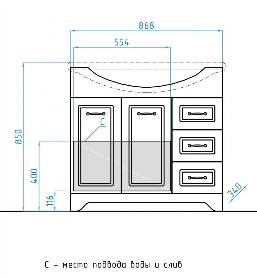 Тумба напольная бренда "Style Line" коллекции "Олеандр-2" классического дизайна, декорированная ручками с керамическими вставками "под бронзу" с изящным рисунком. Направляющие полного выдвижения Hettich; сборка изделия с помощью эксцентриковых стяжек Hafele; все материалы полностью влагостойкие. Данная тумба предусматривает открытую подводку воды