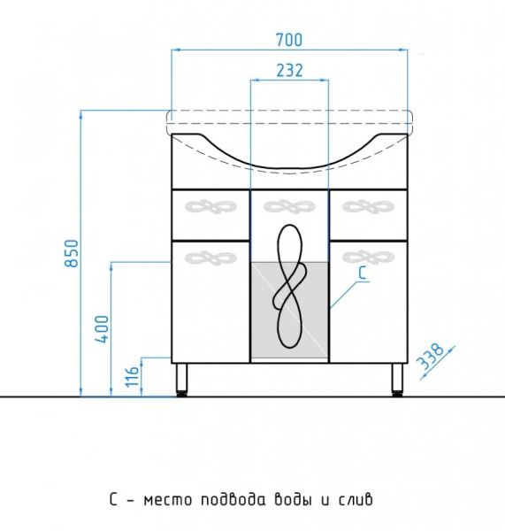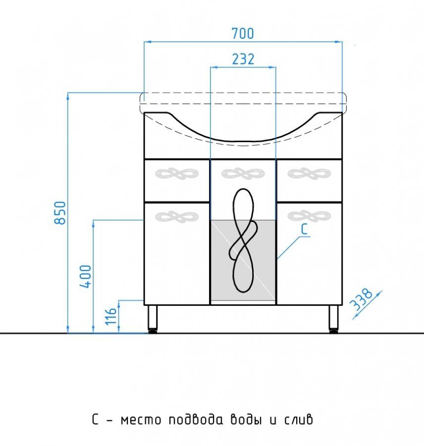 Тумба напольная "Венеция" с элегантной фрезеровкой фасада и декоративными ручками, которые придают всей коллекции особый шарм . Фурнитура - хром, петли на дверцах с механизмом плавного закрывания. Направляющие полного выдвижения Hettich, обеспечивающие плавность и бесшумность хода, высокую надежность и прочность. Данная тумба предусматривает открытую подводку воды