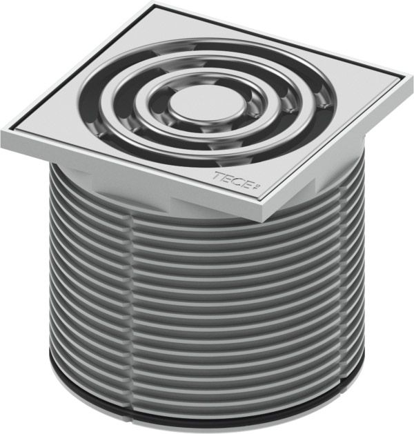 Декоративная решетка, нержавеющая сталь, 100 х 100 мм • Монтажный элемент • Решетка для волос • Стакан гидрозатвора с мембраной • Гидроизоляционная манжета Seal System, 480 х 480 мм • Сифон пластиковый (PP) c горизонтальным поворотным отводом DN 50 и горизонтальным прямым входом DN 40 с заглушкой; -- высота гидрозатвора = 50 мм; -- производительность (согласно DIN EN 1253) при уровне воды над решеткой 10/20 мм: при минимальной высоте монтажа решетки – 0,52/0,89 л/с; при максимальной высоте монтажа решетки – 0,64/1,35 л/с. • Комплект опор со звукоизолирующими прокладками