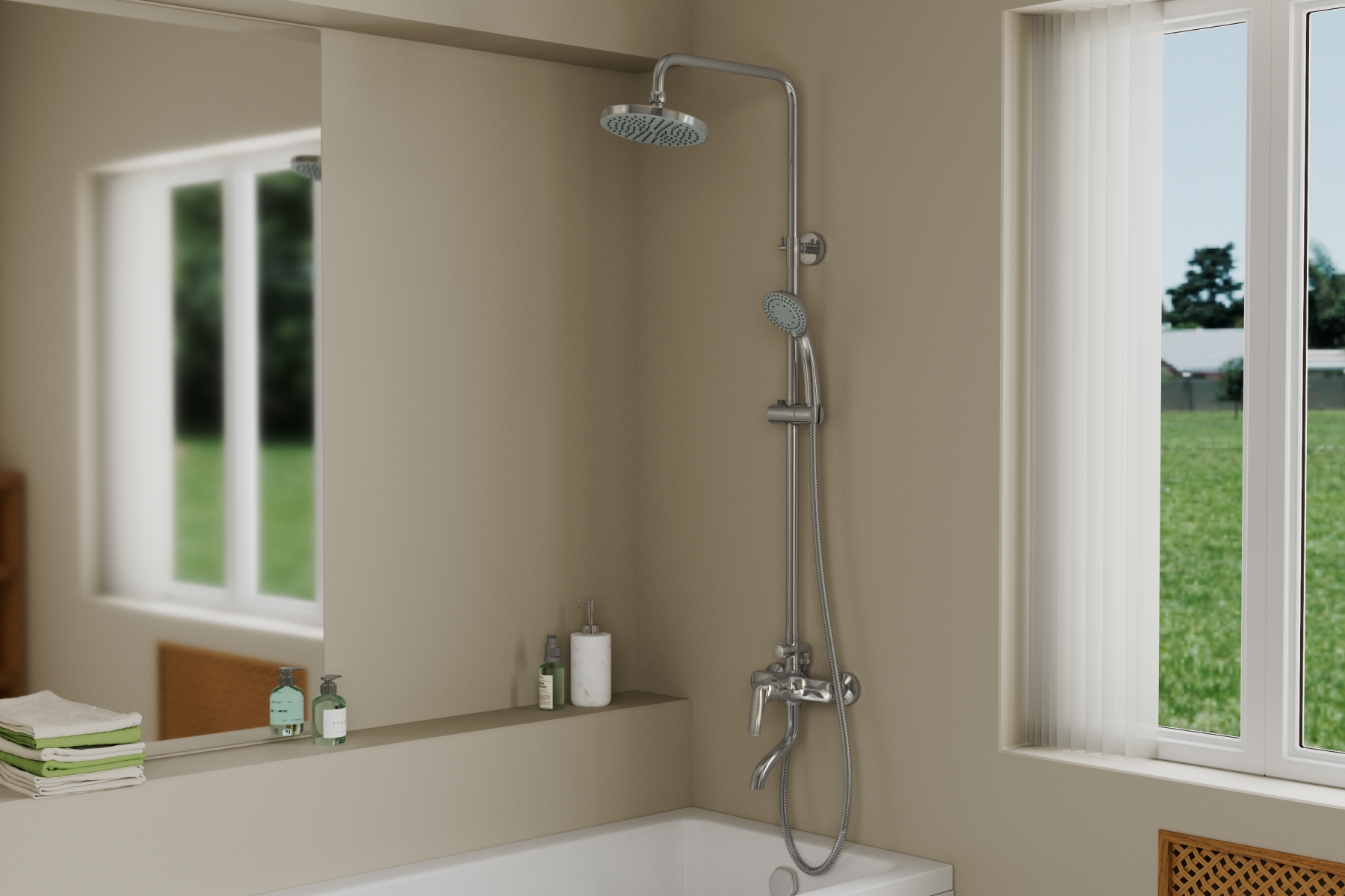 Тропическая душевая система RUSH арт. ST4235-11 из коллекции Socotra изготовлена из высококачественной латуни и имеет рычажное управление. В душевую систему установлен картридж D-35 (RSH102) с керамическими пластинами. Дивертор (переключатель) с керамическими пластинами, 2 режима. В комплекте 3х- режимная душевая лейка, 1-режимный тропический душ, изготовленный из современной прочной пластмассы с никель-хромированным покрытием, душевая штанга раздвижная, держатель душевой лейки поворотный, душевой шланг с латунными гайками 150см, смеситель, индивидуальный пакет, паспорт, гарантийный талон.