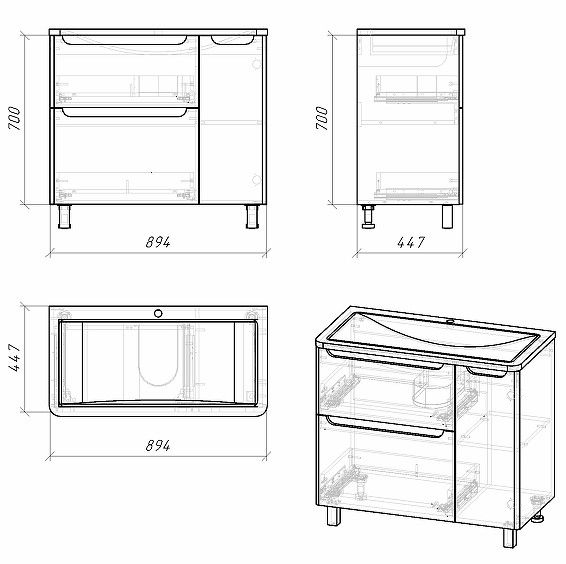 Габариты корпуса тумбы (ШхГхВ): 894х700х447 мм.