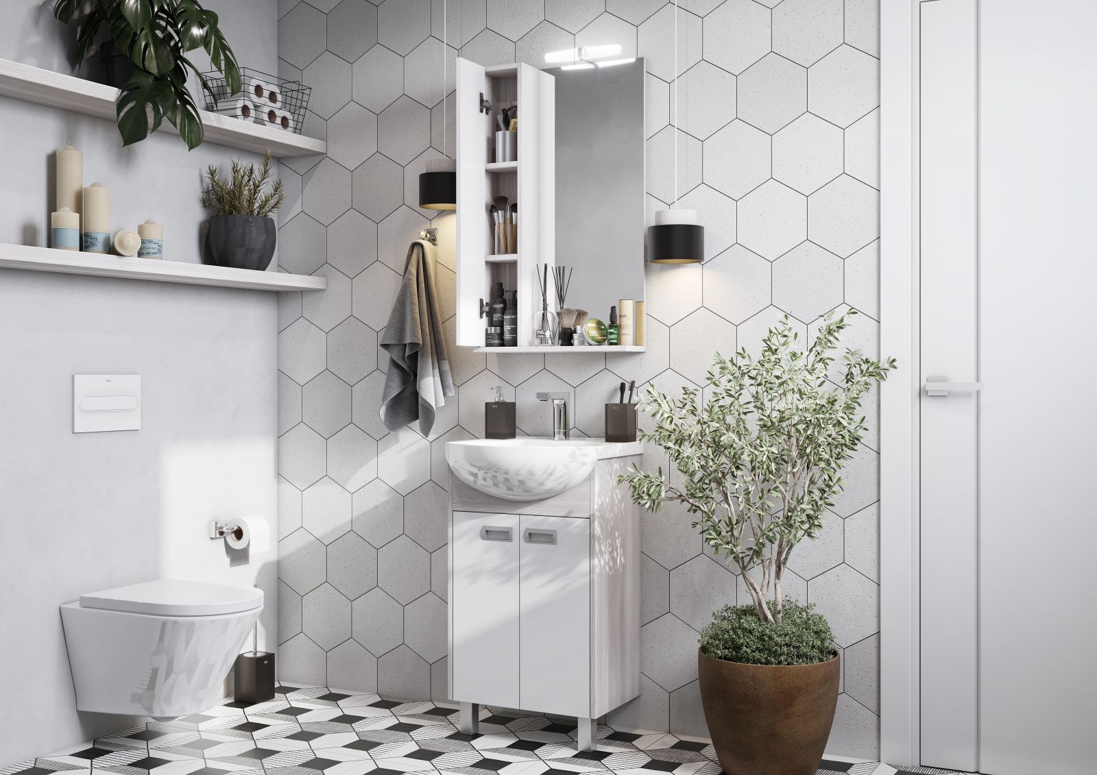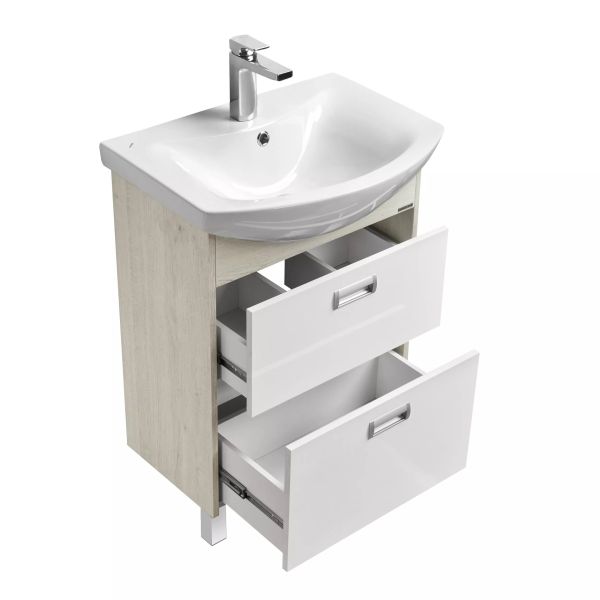 Пространство тумбы шириной 60 см разделено на два вместительных ящика полного выдвижения. Тумбы установлены на металлические ножки и укомплектованы практичными врезными ручками, которые очень удобны в использовании. Боковые стенки и фигурная планка под раковиной изготовлены из ламинированной, текстурированной влагостойкой ЛДСП в цвете дуб сомерсет, а фасады - из крашеной в белый цвет влагостойкой ЛДСП.