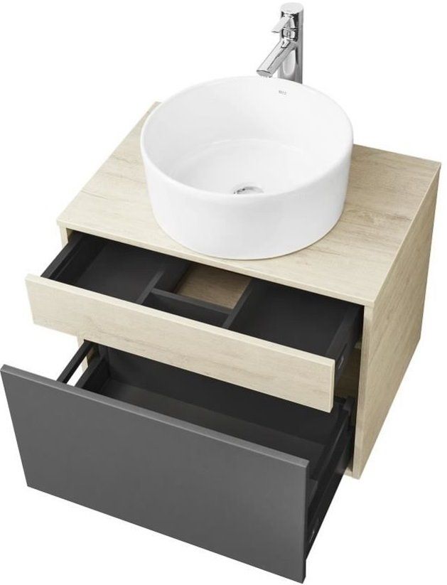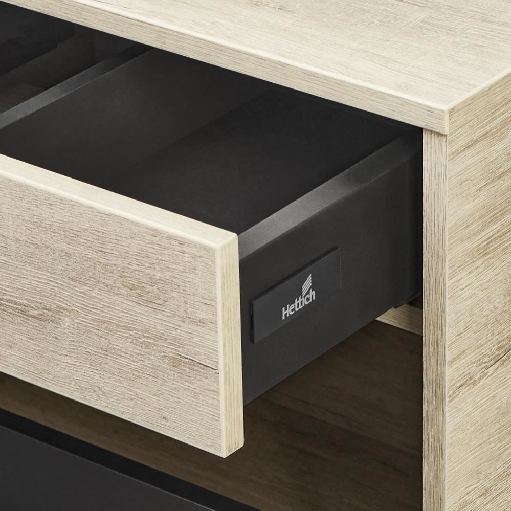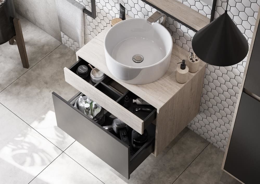 Модуль 65 коллекции Лофт Урбан функционально состоит из двух ящиков полного выдвижения. Верхний ящик тумбы комплектуется внутренней организацией пространства: в нем очень удобно хранить небольшие аксессуары и принадлежности. Вместительный нижний высокий ящик подойдет для более крупных предметов. Функция полного выдвижения ящиков и система открывания push-to-open делают использование тумбы особенно комфортным. Подвесной модуль может комплектоваться различными по размеру и дизайну металлическими черными опорами, высокими и низкими, которые крепятся непосредственно под модуль, кроме того, доступен вариант установки модуля и без опор. Корпус тумбы выполнен из влагостойкой ламинированной ДСП в цвете дуб орегон с текстурой натурального дерева, выгодно подчеркнутым фасадами из МДФ в пленке антрацит с эффектом soft touch.