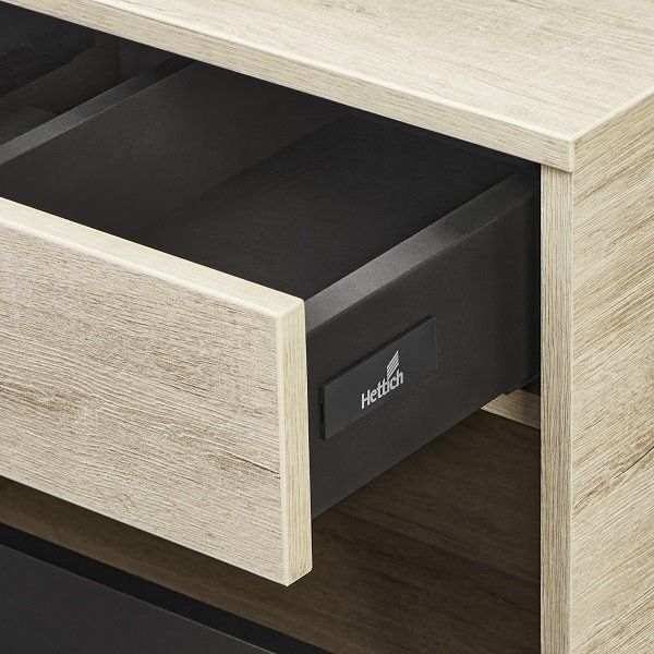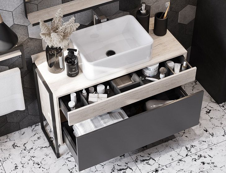 Модуль 80 коллекции Лофт Урбан функционально состоит из двух ящиков полного выдвижения. Верхний ящик тумбы комплектуется внутренней организацией пространства: в нем очень удобно хранить небольшие аксессуары и принадлежности. Вместительный нижний высокий ящик подойдет для более крупных предметов. Функция полного выдвижения ящиков и система открывания push-to-open делают использование тумбы особенно комфортным. Подвесной модуль может комплектоваться различными по размеру и дизайну металлическими черными опорами, высокими и низкими, которые крепятся непосредственно под модуль, кроме того, доступен вариант установки модуля и без опор. Корпус тумбы выполнен из влагостойкой ламинированной ДСП в цвете дуб орегон с текстурой натурального дерева, выгодно подчеркнутым фасадами из МДФ в пленке антрацит с эффектом soft touch.