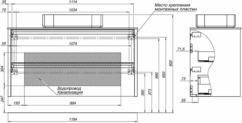Габариты корпуса тумбы (ШхВхГ): 1184х620х460 мм.