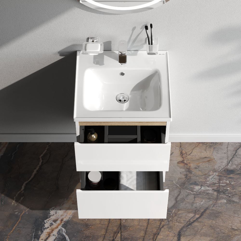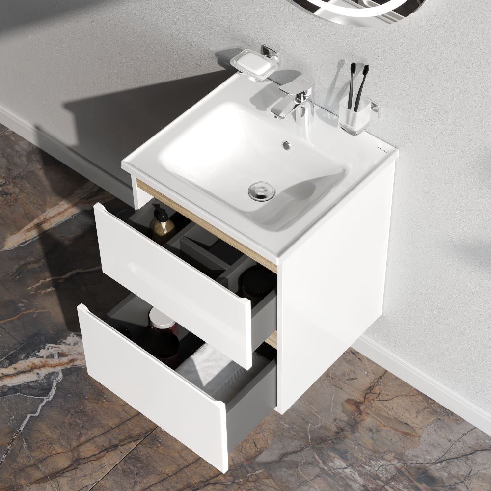 Подвесная тумба помогает сэкономить место в ванной комнате, визуально увеличивая пространство. Установка на удобной высоте. Оптимизация хранения вещей внутри ящиков. Грамотно расположенные скрытые коммуникации внутри тумбы. Бортик по контуру раковины препятствует проливу воды за мебель. Сантехнический фарфор - долговечный и прочный материал, обладающий высокой гигиеничностью.