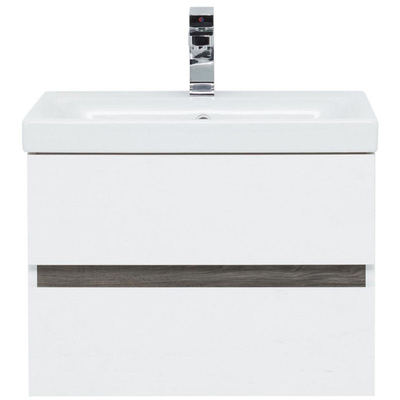 Тумба под раковину Aquanet Беркли 60 белый/дуб рошелье имеет изюминку - контрастную декоративную полосу между ящиками в цвете «дуб рошелье». Корпус и фасады тумбы выполнены из влагостойкого ЛДСП и покрыты глянцевой белой эмалью. В конструкции тумбы использованы интегрированные ручки без острых краев и внутренних углов.