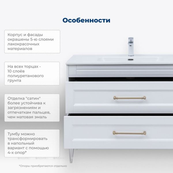 Тумбу можно использовать как навесную или трансформировать в напольную — для этого потребуется дополнительный комплект из 4 опор Бостон new.
