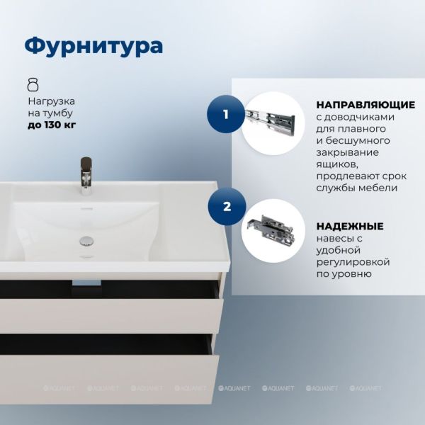 Корпус и фасады изготовлены из влагостойкой ЛДСП с эмалевым покрытием, что обеспечивает устойчивость к влаге и долговечность. Внутренние детали выполнены в цвете антрацит, создавая гармоничный контраст.