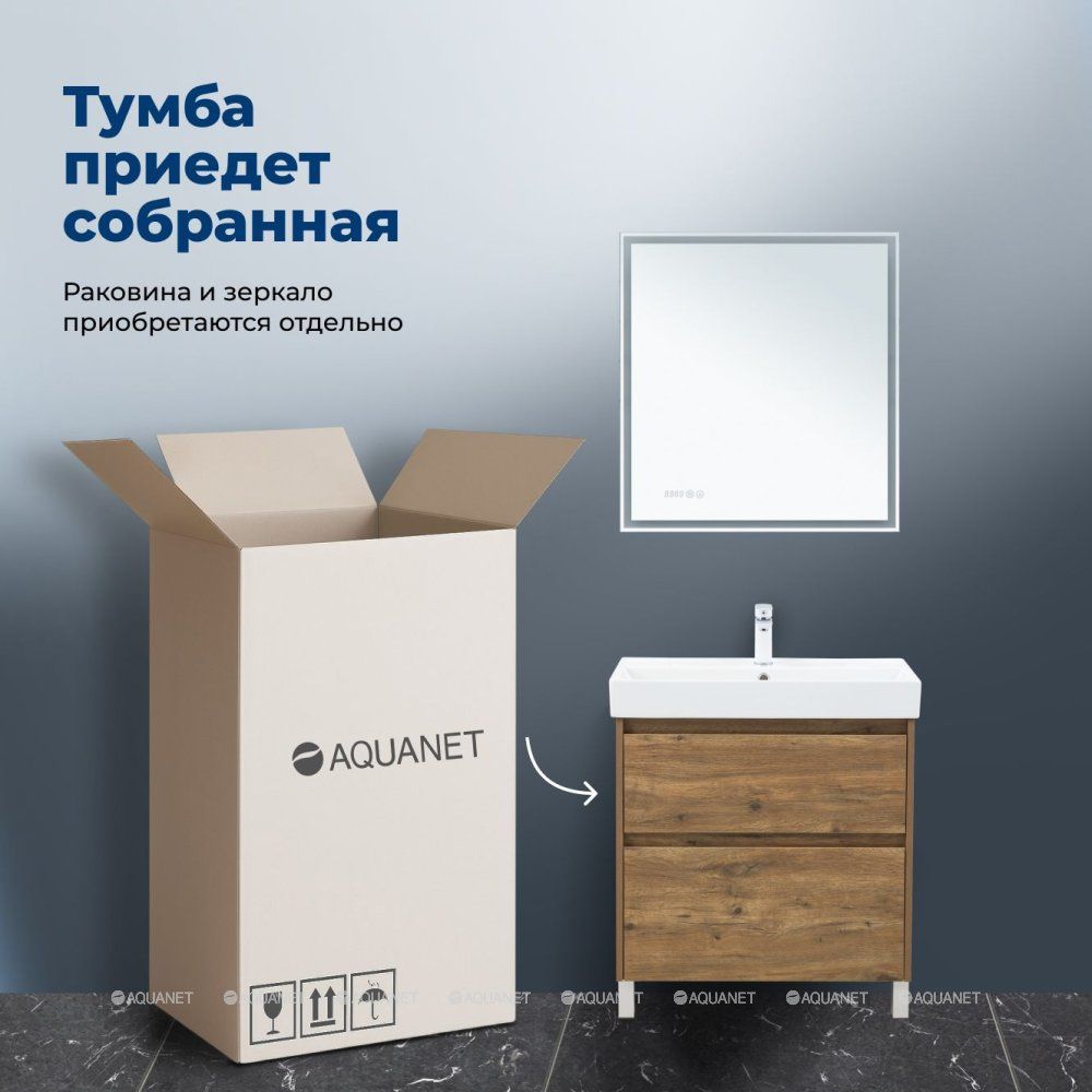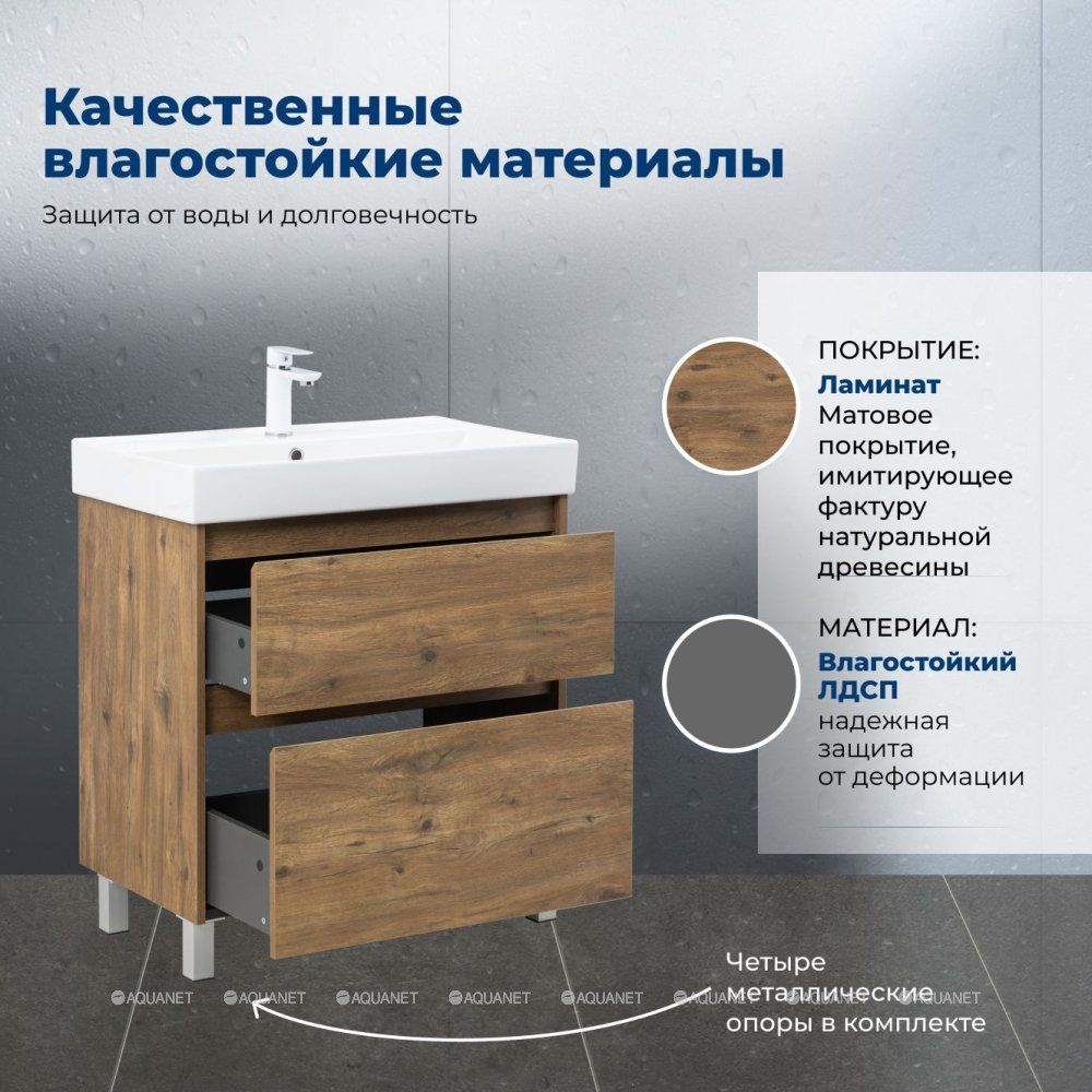 Стильная и практичная тумба для ванной комнаты с продуманной конструкцией. Модель Aquanet Nova Lite 2.0 75 выполнена в цвете дуб рустикальный – матовое покрытие имитирует фактуру натурального дерева и не оставляет отпечатков пальцев.