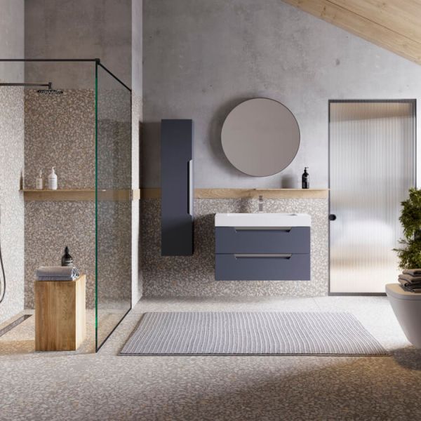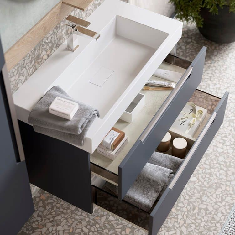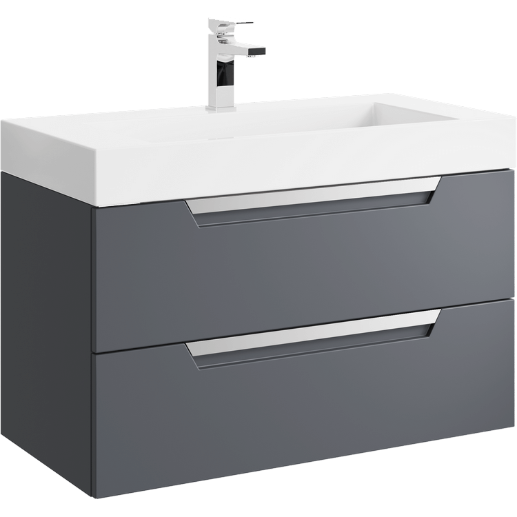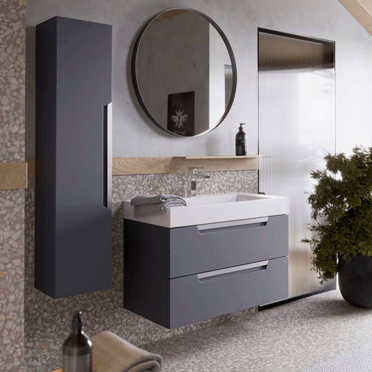 Подвесная тумба в сером матовом цвете с двумя ящиками под умывальник из литьевого мрамора.Коллекция мебели Cube – это строгие линии мебели для современных интерьеров, подчёркнутые искусным исполнением. Подвесные гарнитуры Cube поставляются в размерах 70 и 90 см. Доступные цвета мебели – белый и серый. Финальный слой лака – матовый.