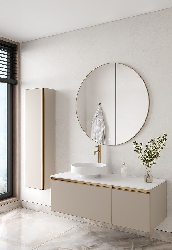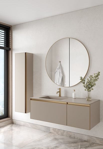 Главной особенностью коллекции являются обрамления фасадов из алюминия в самых трендовых цветах: графит, матовое золото, матовый черный и серебро. Эти обрамления идеально дополняют сантехнику в ванной комнате.