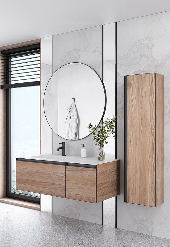 Главной особенностью коллекции являются обрамления фасадов из алюминия в самых трендовых цветах: графит, матовое золото, матовый черный и серебро. Эти обрамления идеально дополняют сантехнику в ванной комнате.