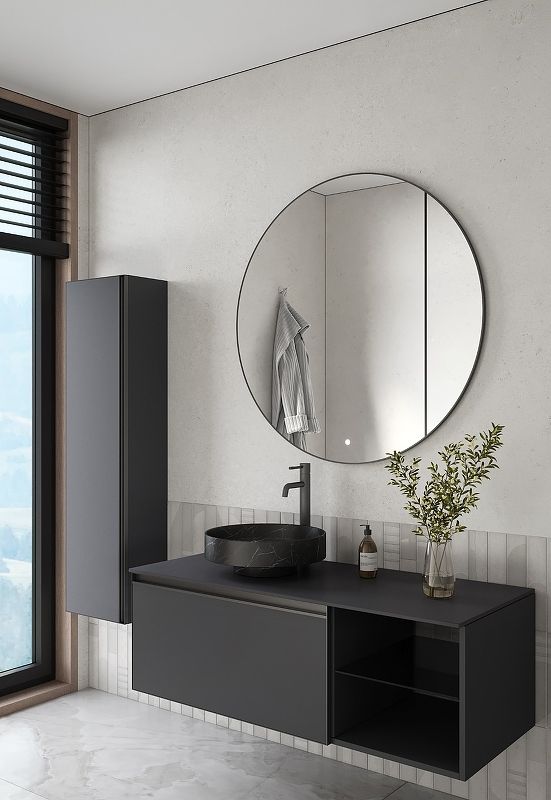 Главной особенностью коллекции являются обрамления фасадов из алюминия в самых трендовых цветах: графит, матовое золото, матовый черный и серебро. Эти обрамления идеально дополняют сантехнику в ванной комнате.