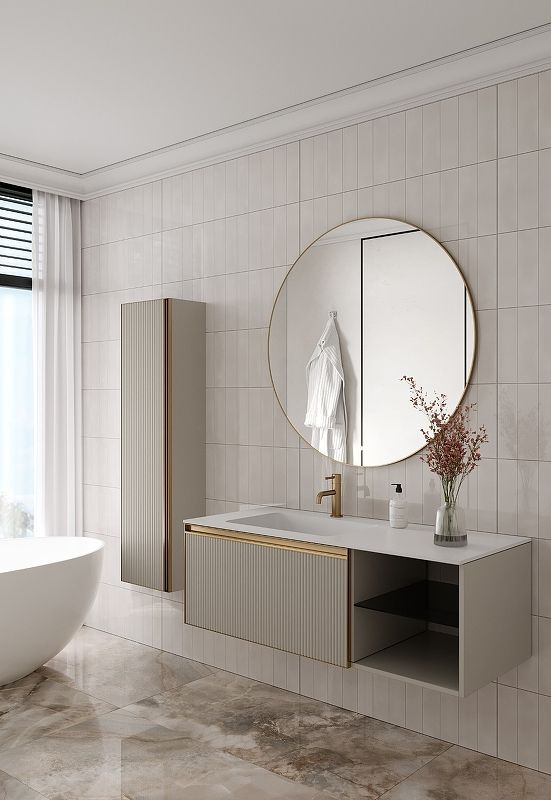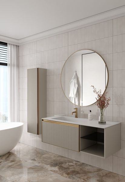Главной особенностью коллекции являются обрамления фасадов из алюминия в самых трендовых цветах: графит, матовое золото, матовый черный и серебро. Эти обрамления идеально дополняют сантехнику в ванной комнате.