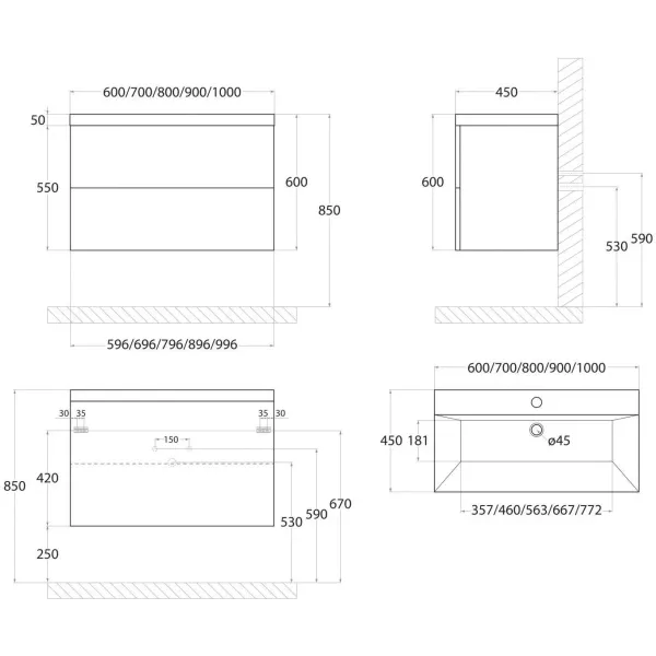 База под раковину подвесная с двумя выкатными ящиками, 900x450x550, AM-Verona-Push-900-2C-SO-KV Подробнее