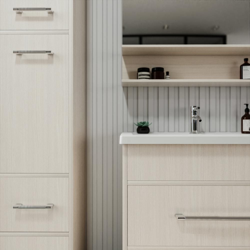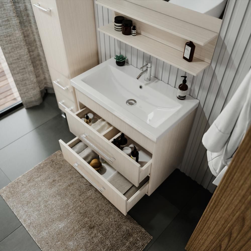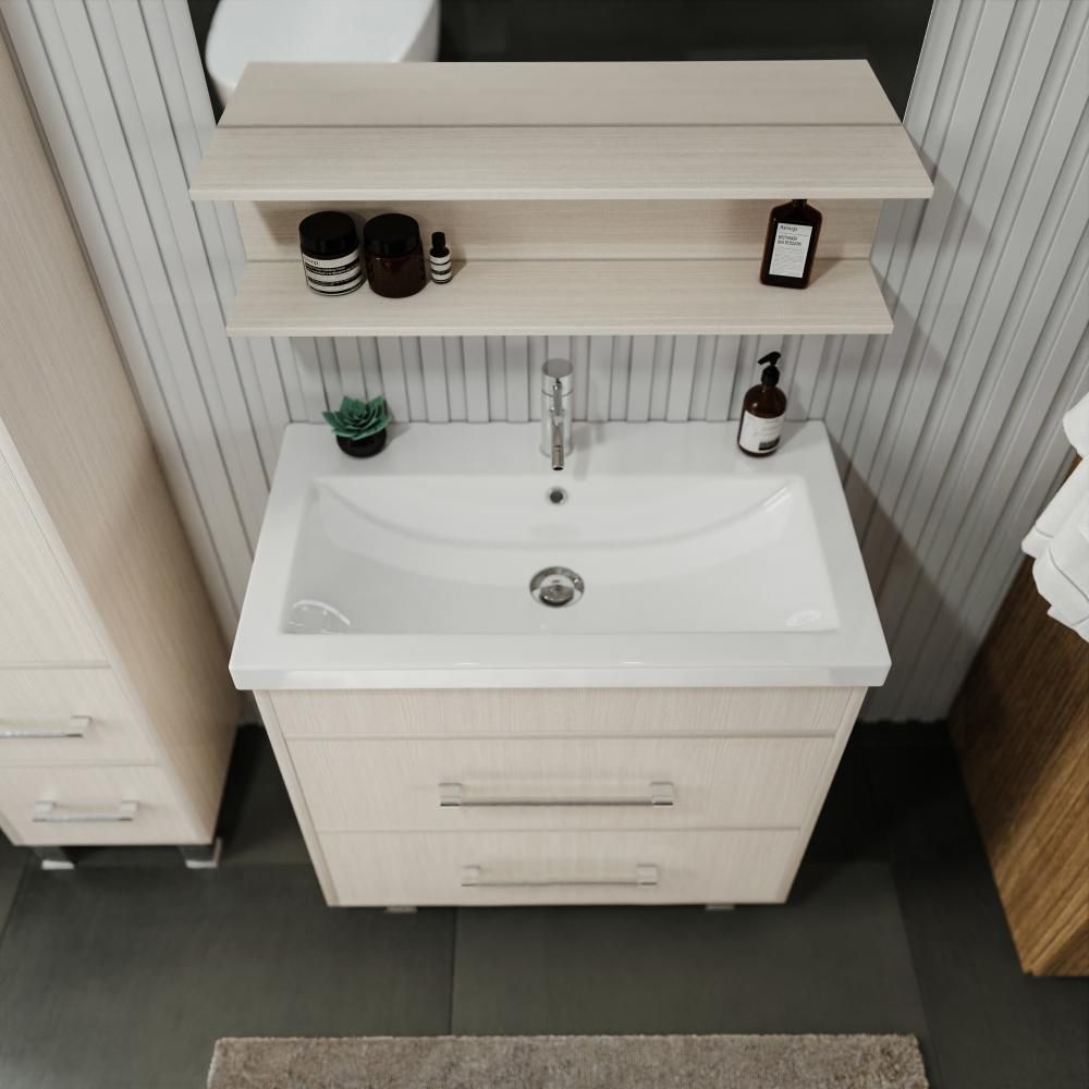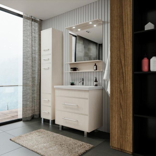 Удобная система хранения позволяет размещать все необходимое для гигиенических процедур, а её продуманные размеры отлично вписываются даже в небольшие помещения. Стильные ручки и элегантные фасады придают тумбе особый шарм, а разнообразие цветовых решений позволит выбрать модель, соответствующую любому интерьеру – от классического до модерн.