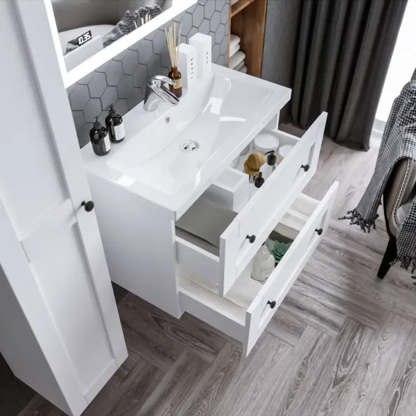 Функциональные особенности таких тумб варьируются от наличия выдвижных ящиков до встроенных систем хранения, которые помогают организовать пространство ванной комнаты. Важным аспектом является также возможность выбора различных цветовых решений и отделок, что позволяет гармонично вписать тумбу в любой интерьер – от классического до ультрасовременного.