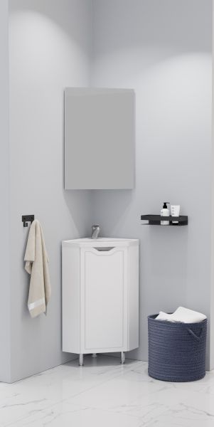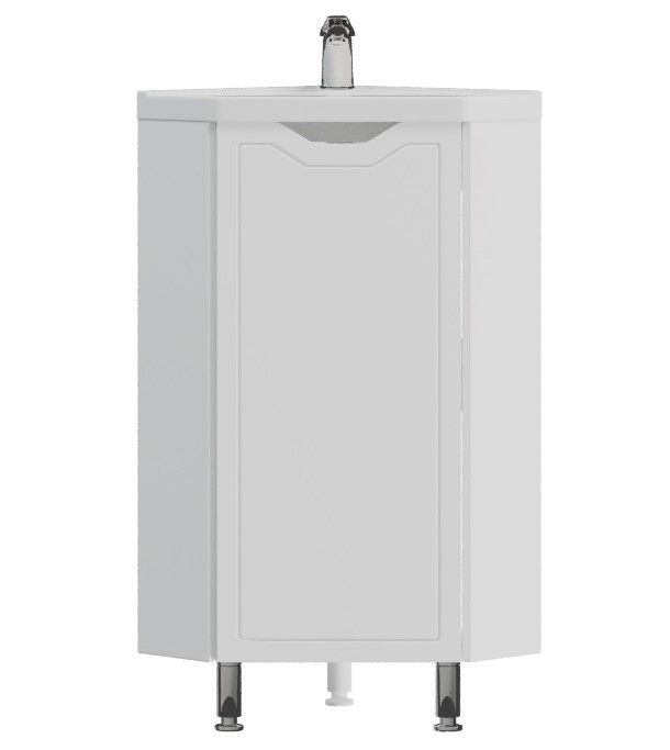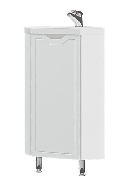 Тумба под раковину Corozo Мирра 40, напольная, белая, SD-00001642Коллекция мебели для ванных комнат МИРРА - подходящий вариант для тех, кто предпочитаетлегкое, гармоничное пространство, полное спокойствия и умиротворения. Данная коллекция позволит рационально использовать угловое пространство в ванной комнате. Тумба угловая, оснащена одной распашной створкой, позади дно. Тумба стоит на 2 металлических опорах и 1 пластиковой. Корпус ЛДСП белый, фасады МДФ в белой плёнке ПВХ. Корпус мебели выполнен в цвете «Белый глянец». Ручки на фасадах отсутствуют, вместо них предусмотрены интегрированные ручки и декоративная фрезеровка по периметру фасада. Бесшумность и длительный цикл эксплуатации обеспечивают петли с доводчиком.