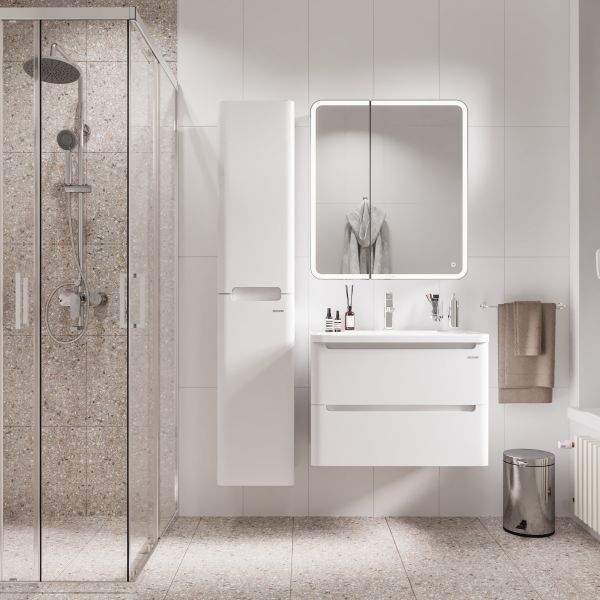 Тумба выполнена из влагостойкого МДФ покрытая белой глянцевой краской, устойчивая к перепадам температур и высокой влажности, крепится к стене и занимает мало места.