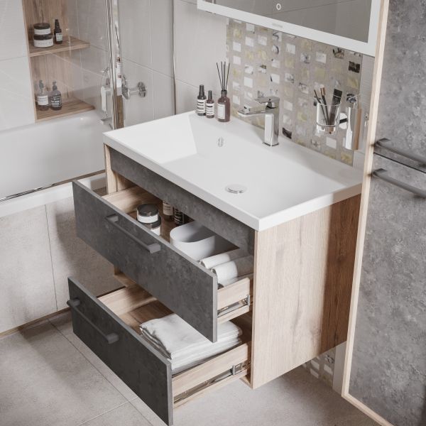 Тумба подвесная Реал 80 см - функциональное, стильное и практичное исполнение. Фасады в цвете бетон безупречно сочетаются с фактурой под дерево и позволяют тумбе органично вписаться в интерьер ванной комнаты в стиле лофт и модерн.