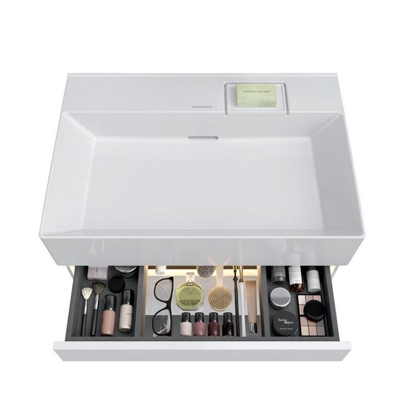 Подвесная тумба Logica — это детально проработанный дизайн и вдохновляющие технологические возможности. Так, при приближении к тумбе автоматически загорается подсветка между двумя выдвижными ящиками. Дистанцию срабатывания подсветки можно настроить с помощью инструкции из комплекта поставки. Фасады и корпус выполнены из МДФ в цвете «Белый белоснежный»: верхний фасад — глянцевый, нижний фасад и корпус — матовые. Тумба имеет два выдвижных ящика с открытием Push to open, с внутренней отделкой «Лён Антрацит». Верхний ящик, благодаря нестандартному расположению сифона, содержит больше полезного пространства и удивляет стеклянной вставкой в основании: через такое «окно» снизу струится свет, эффектно подчёркивая содержимое. В комплектацию тумбы входят крепление, гарантийный талон, инструкция по установке, инструкция по регулировке подсветки и открытия ящиков.