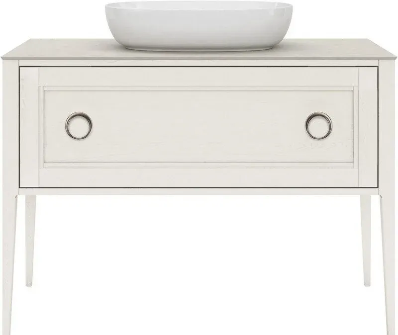 Напольная тумба с одним выдвижным ящиком выполнена из массива ясеня с отделкой «открытая пора». Вместительный ящик с плавным закрыванием украшен двумя крупными ручками. Сочетается с керамическими столешницами PLAZA Classic шириной 120 см. Подходит для установки раковин с типом монтажа «встраиваемая снизу».