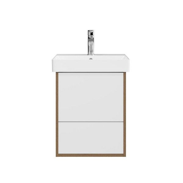 Корпус подвесной тумбы выполнен в цвете «Швейцарский Вяз», фасады двух выдвижных ящиков с удобным открыванием "push-to-open" имеют контрастную белую отделку. Тумба предназначена для установки раковины PRO шириной 50 см.